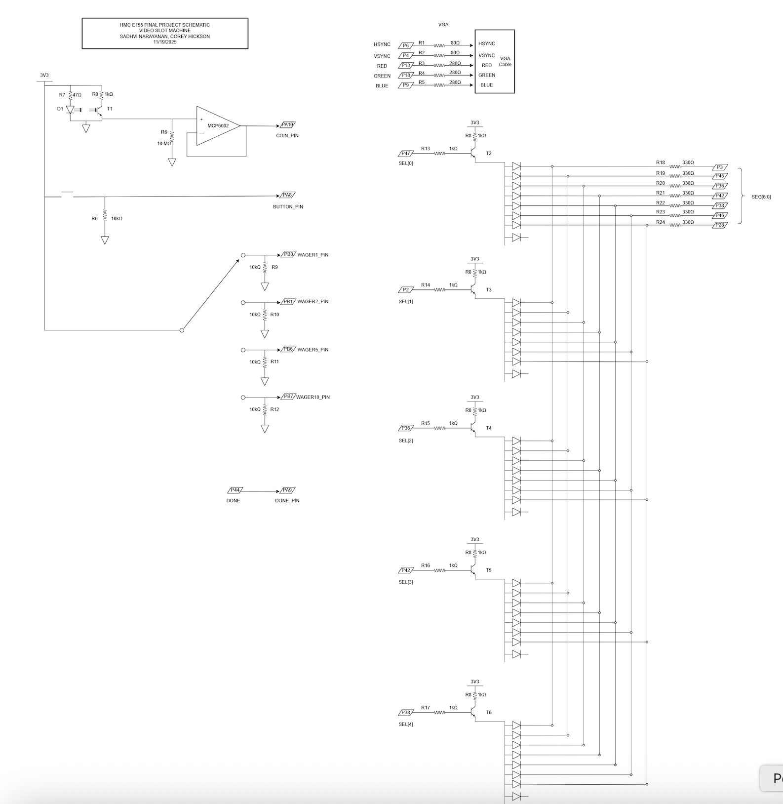 The schematic in Figure 1 demonstrates the overall design of how we are connecting the FPGA to the VGA monitor. Because we are only using 3-bit resolution for the pixels, we are scaling the voltage outputs to 0.7 if we want to display a color.