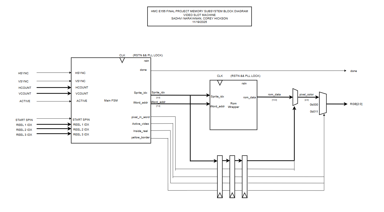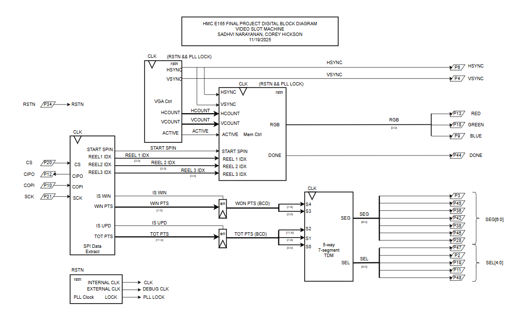 The FPGA handles all visual output and timing-critical operations for the slot machine. A VGA controller generates sync signals and drives RGB output at 25.5 MHz using the PLL, and a memory controller fetches sprite data from EBR blocks based on the current reel positions and VGA coordinates. The system receives commands from the MCU over SPI—including where each reel should stop and how many credits were won along with the player’s total credit count, in order to create a realistic slot machine animation. We have a couple modules for the seven-segment displays which drive the credit and winnings displays based on values sent from the MCU.