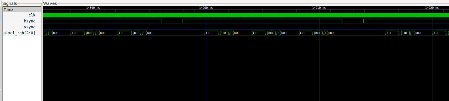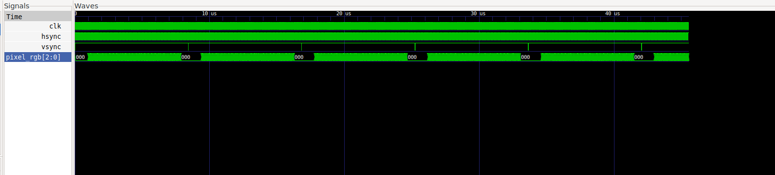 Our testbench for the VGA controller did not have to provide any stimulus aside from clock and reset signals. The testbench let the VGA controller run through several frames, continuously checking the outputs of the desisgn against a set of design properties described with SystemVerilog assertions, which confirm proper timing in acordance to the VGA specification. Figure 8 shows the VGA signal waveforms from this testbench.