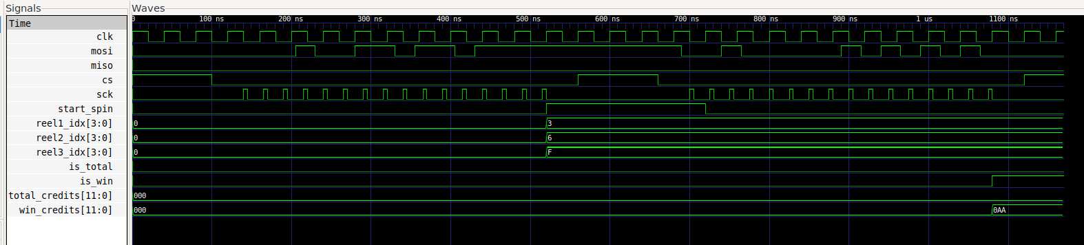 From these waves we see a spin request and win request be accepted and properly parsed by the SPI receiver, as demonstrated by the module correctly driving the ending sprite indices and win credits following the two requests.