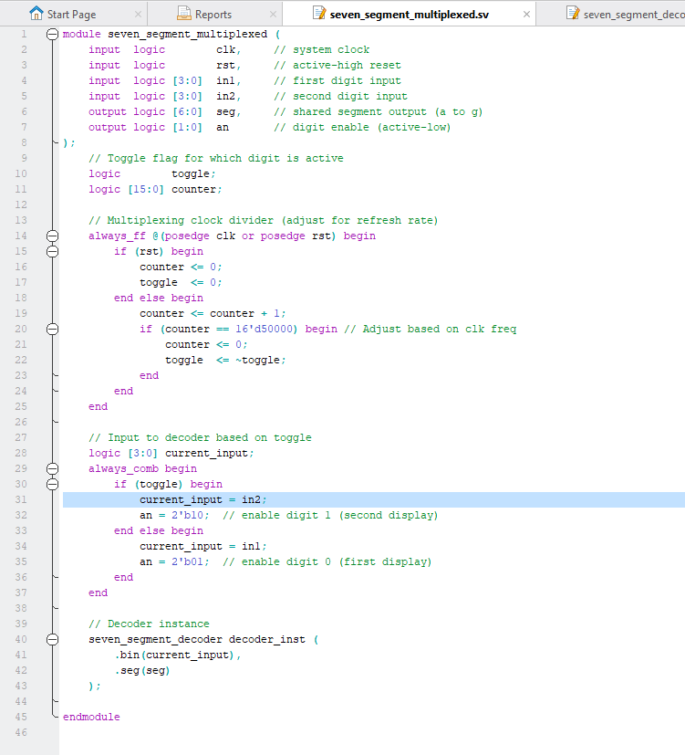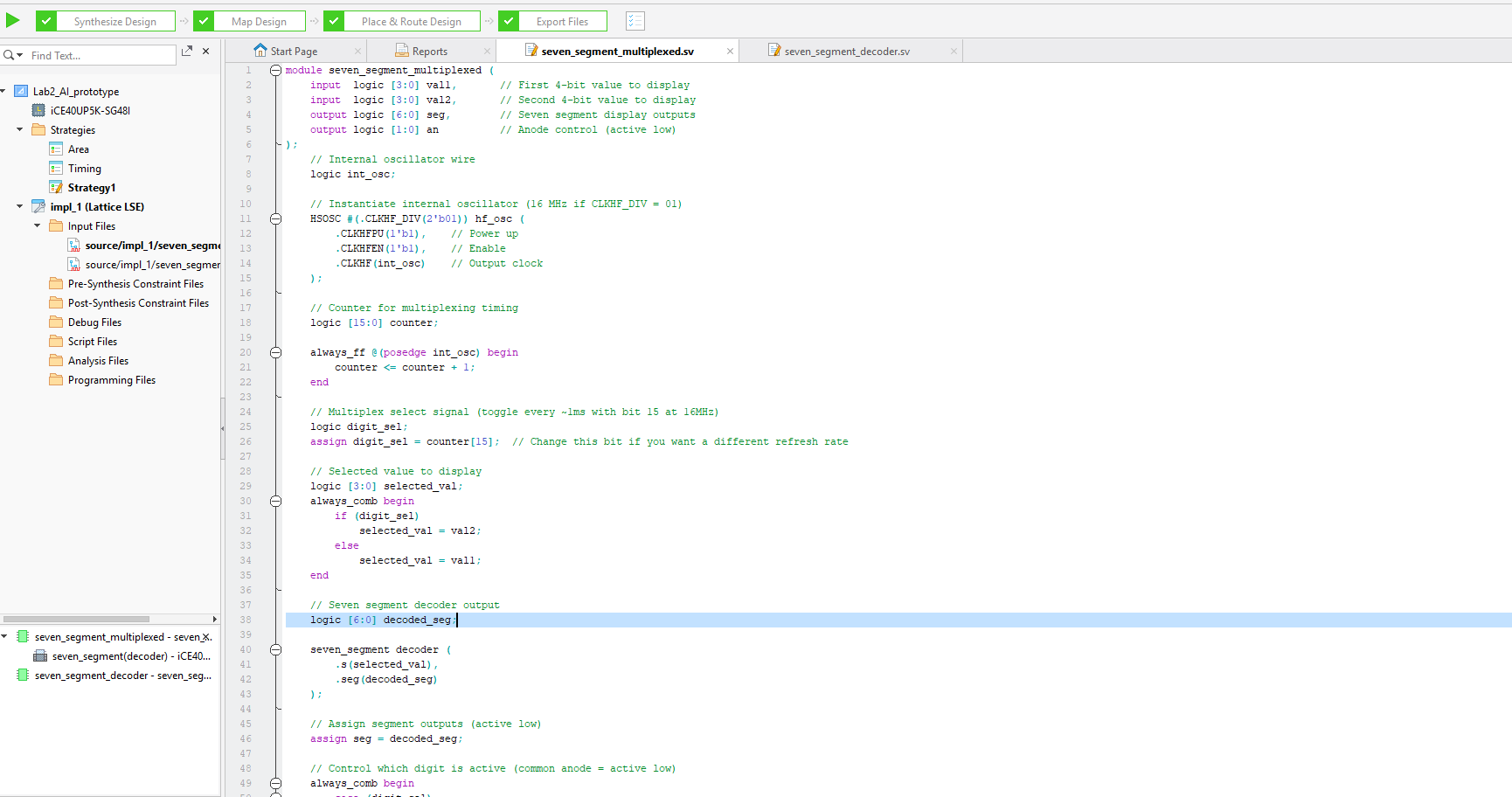 Overall, I would rate the quality of this code pretty good since it seems to be optimal in all the assignments, module interaction, and clock multiplexing that it does. In terms of verilog contstructs that were unknown to me, I did not see anything striking - I have used almost everything used in the AI version. However, the AI did make the counter a little different to mine, with the addition, and counter limit check under the same else conditional, however this was just a design decision. The AI code synthesized both times, I tried it, however the first time there was a logic gap in the way it did the time multiplexing. One important thing is that it is not running at the right frequency, it is running too fast since it is just using the HSOSC, so this would be something that might need more prompting. In terms of warning messages, I just got the expression size 32 bits truncated to fit in target size 16, but I have also been getting this warning message as well. The next time, I might give it a little more context on what I have available, and perhaps define some of the terms I am using - although this shouldn’t have been necessary. Also, it did not use the HSOSC oscillator that I am using because it did not have the context of the lab, and what we were using.