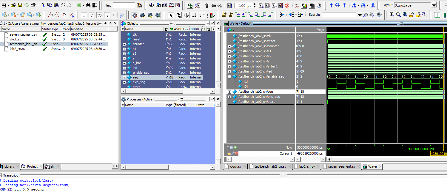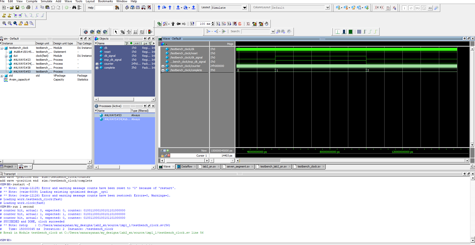 I was able to accomplish all of the prescribed tasks in this project. I also met all the intended design objectives, and was able to check off all the components in the spec, along with the excellence components. Figure 5 shows a screenshot of the QuestaSim Simulation of the clock module. This is the simulation run with the self checking test-bench without testvectors. Figure 6 shpws that our enable signal is toggling every few cycles in order to control which segment is being displayed on the display. Figure 7 shows the testbench designed for the overall top-level design, which was also designed without testvectors and was instead an assert based testbench.