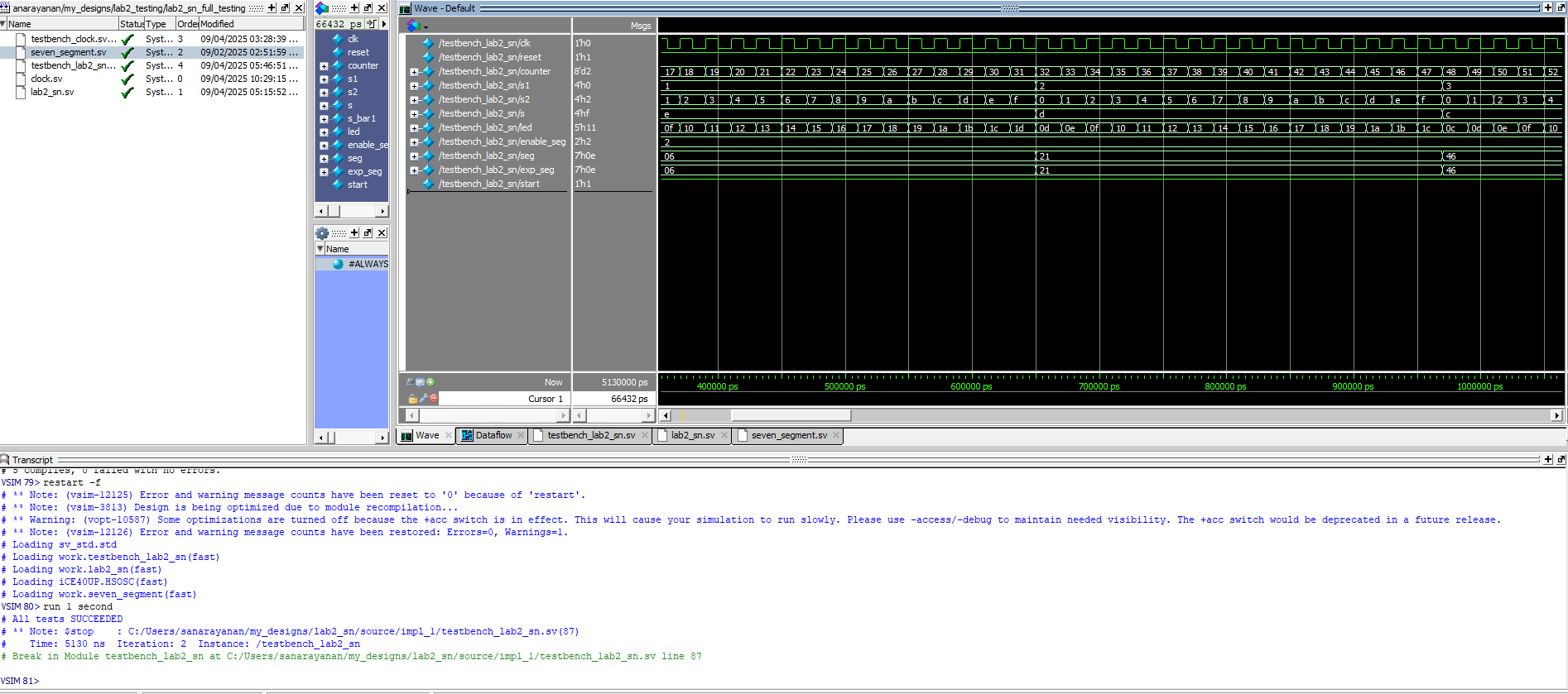 Then, in order to test the rest of my design, I had another testbench. This time, I did not use testvectors, but rather leveraged assert statements. I generated a counter that was 8-bits wide, and each time it would split this 8-bit bus into two 4-bit busses, which would simulate the inputs on both by 4-input DIP switches. I then made sure the addition of the led signal was equal to the sum of both of 4-bit busses. And then, based on the enable signal asserted from my top-level module, I made sure that the actual seven-segment output, matched with the one I was chosing based on the enable signal and switch value.