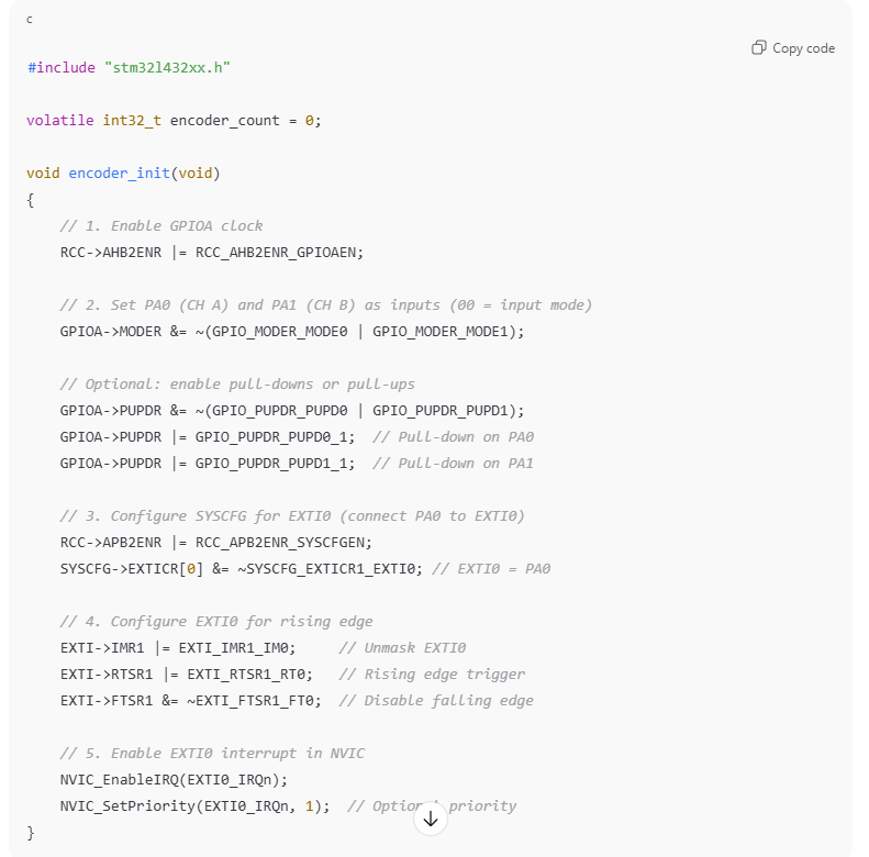 Figure 4 shows the result of the AI prototype, and it is somewhat similar to my code but also very different at the same time. First off, in the code, it uses the masks defined in the header files for the stm32l432xx.h, whereas I directly accessed the bits using bit shifting, and did not use a predefined mask. Additionally, the logic does not consider setting up encoder B’s pin signal on the SYSCFG->EXTICR register which is interesting. I guess, it is not using the highest resolution in the design which is why it is only operating on the rising and falling edge of one of the signals. Furthermore, it is not calculating the direction of the motor based on the values of the encoder pulses, and is also not calculating the angular velocity properly. I also think in the interrupt handler, it is it checking for both bits of the encoder pins at the same time, however in order to determine direction, you need to address the cases differently for the values of the pulses. Furthermore, I am not sure if it knows to use 5V tolerant pins, so this is not really a consideration it made. However, overall it did try to pick pins on the same interrupt line to make it easier to handle with just one interrupt request handler function.