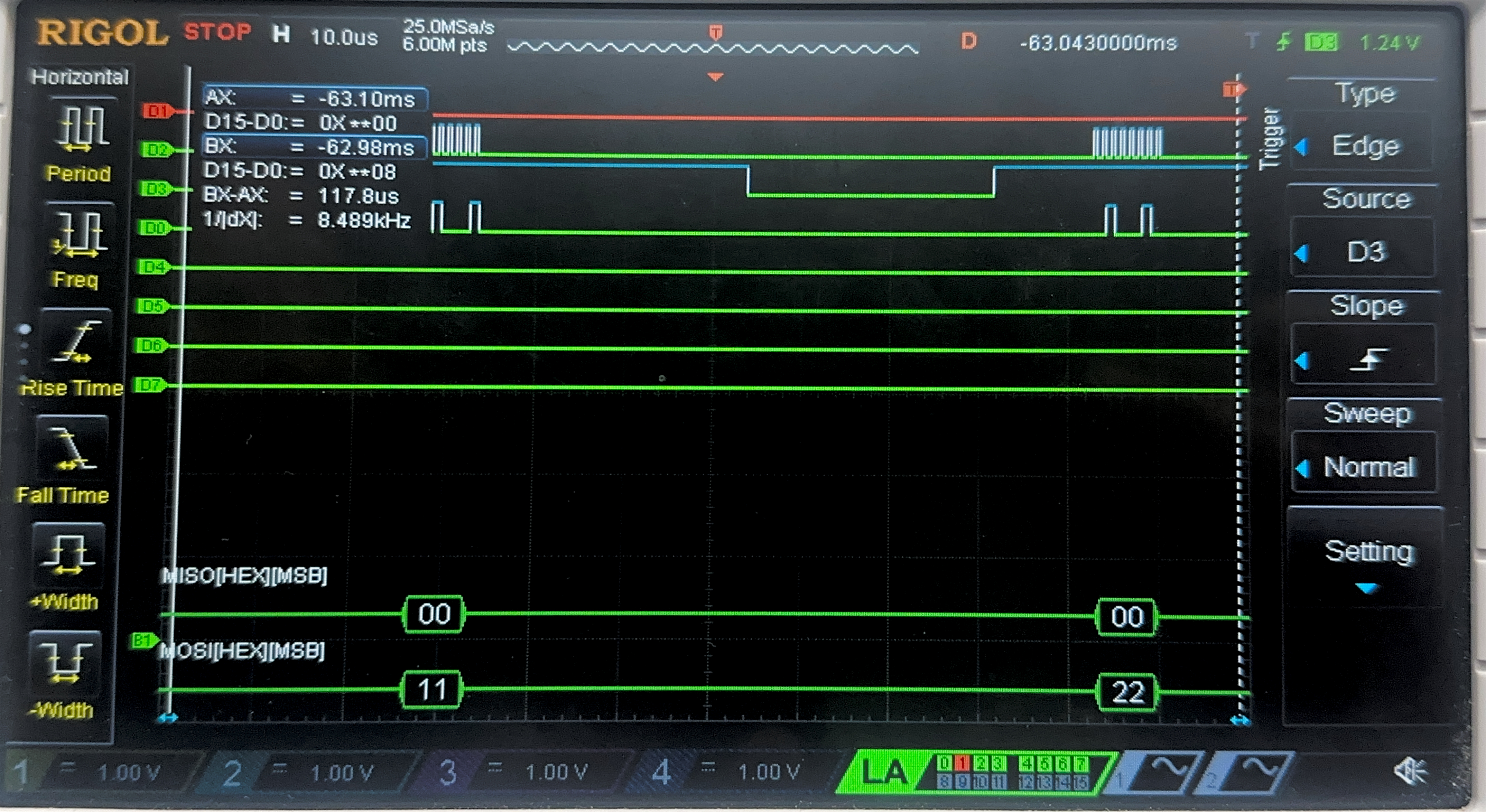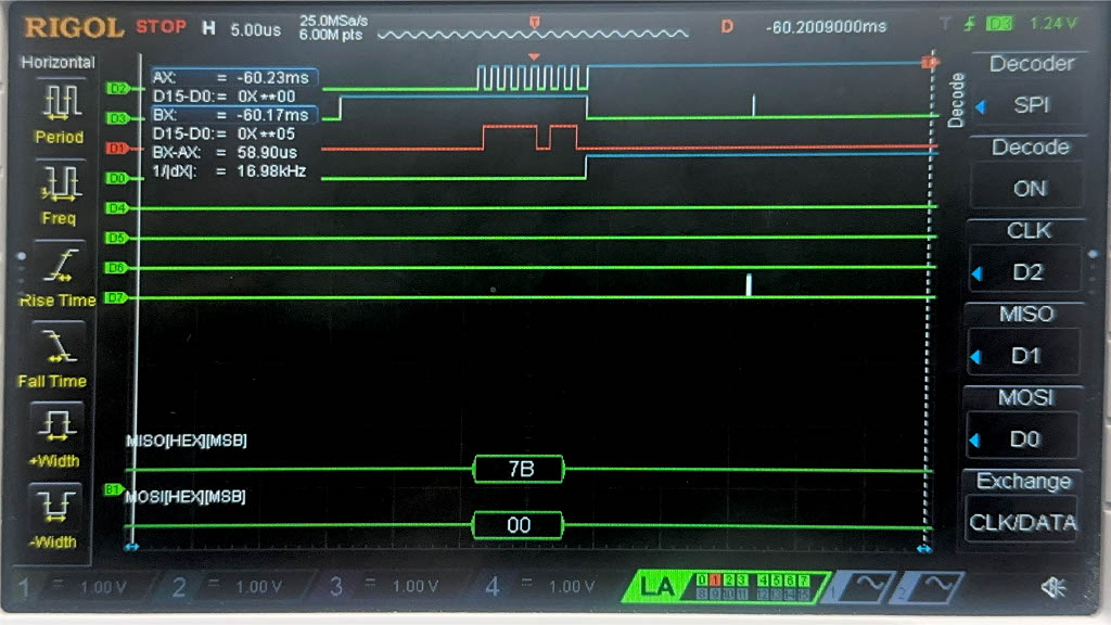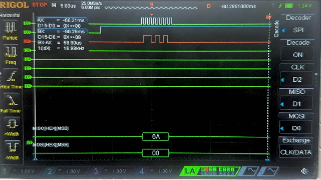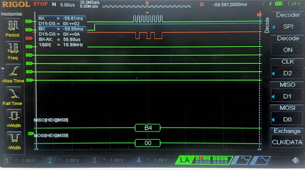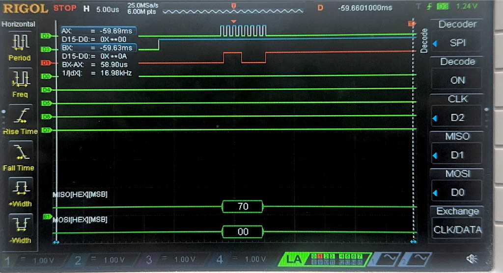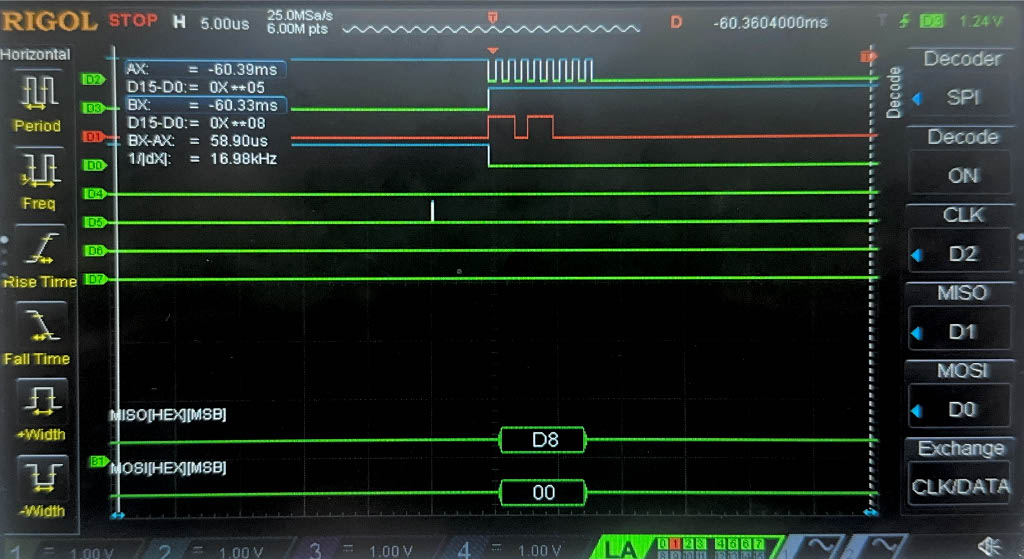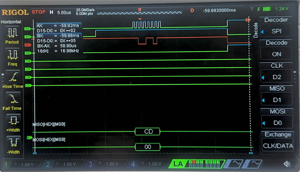 Below are the images from the return transaction, on MISO/CIPO where the FPGA is responding with the ciphertext: