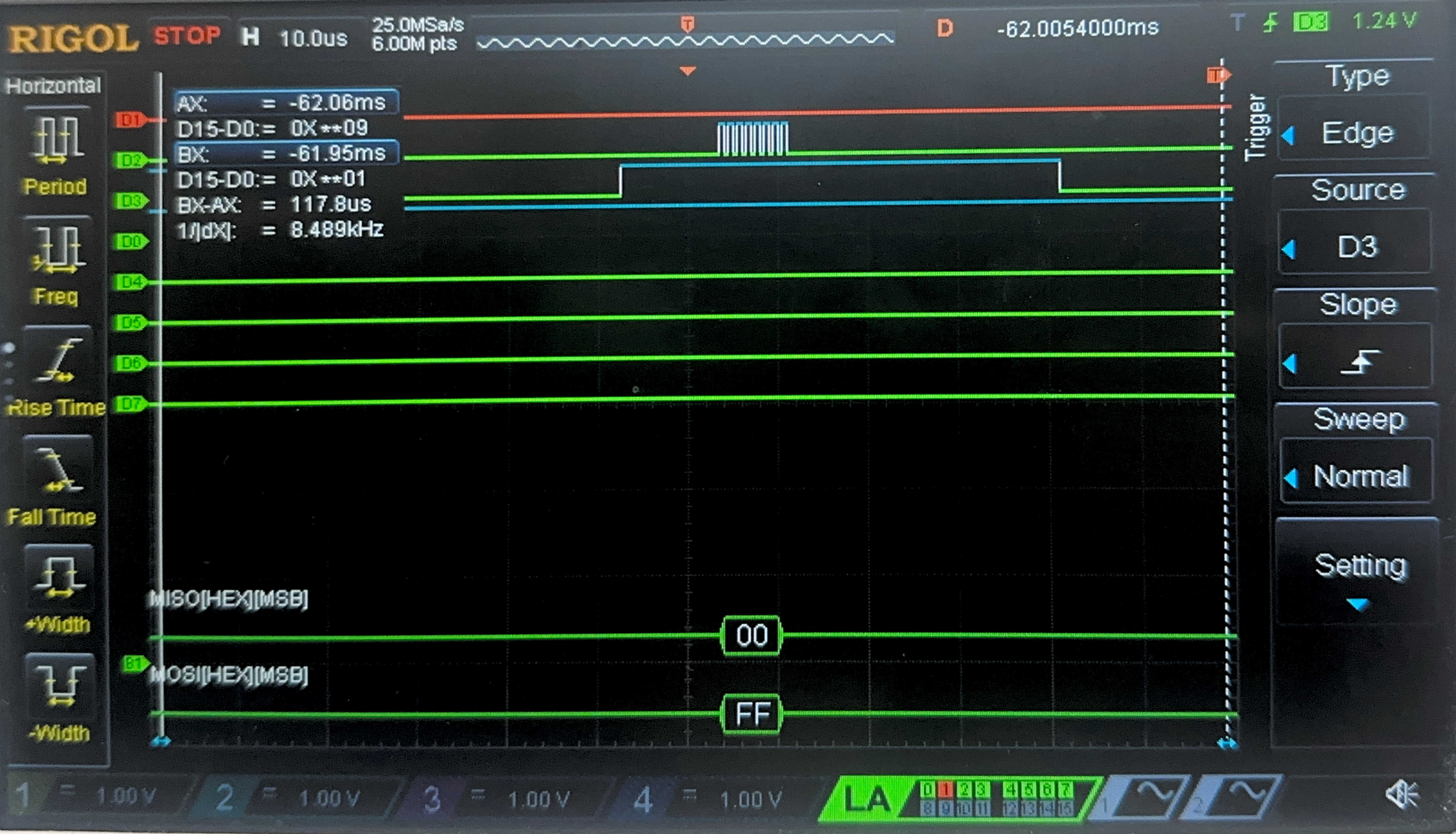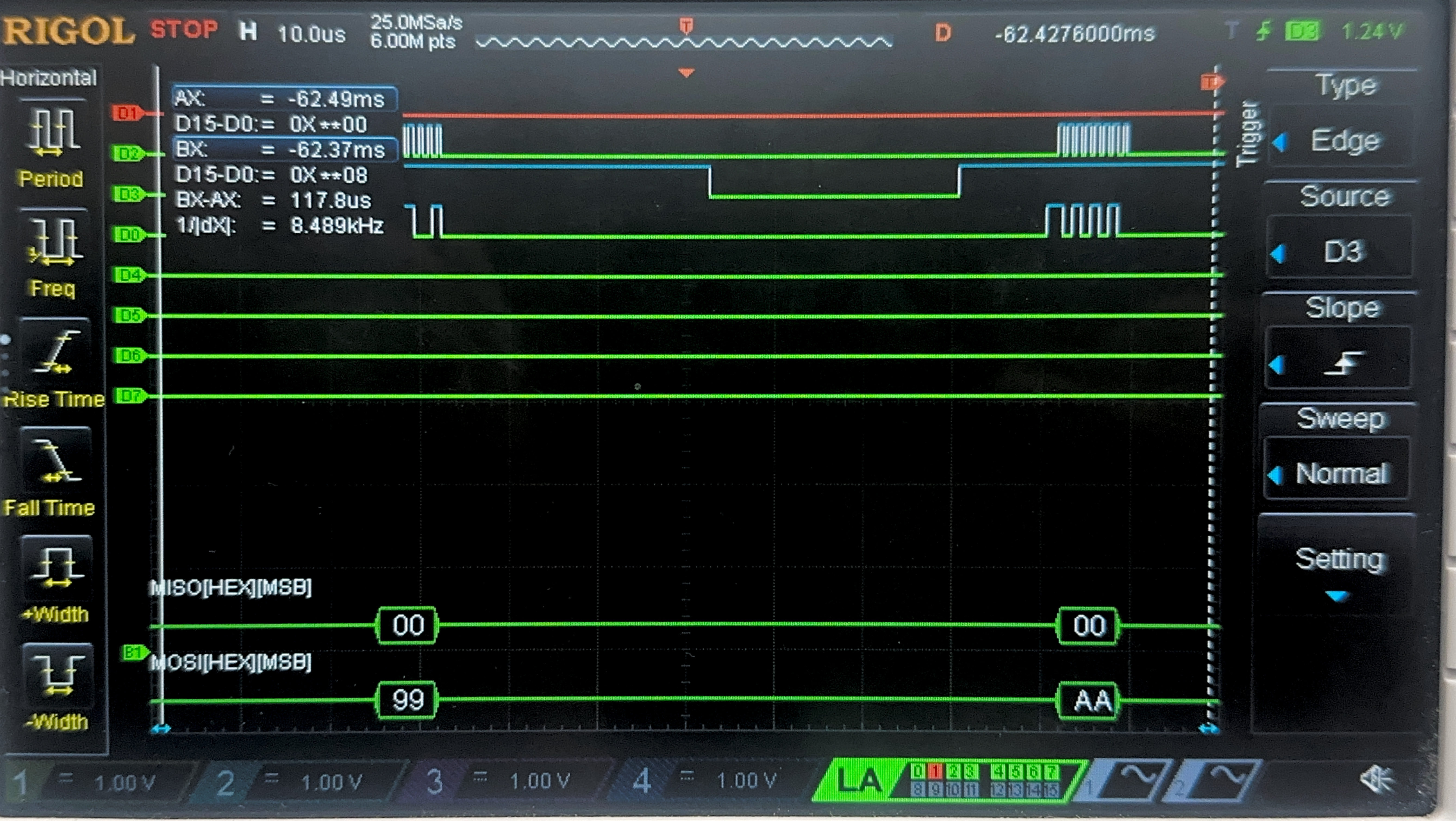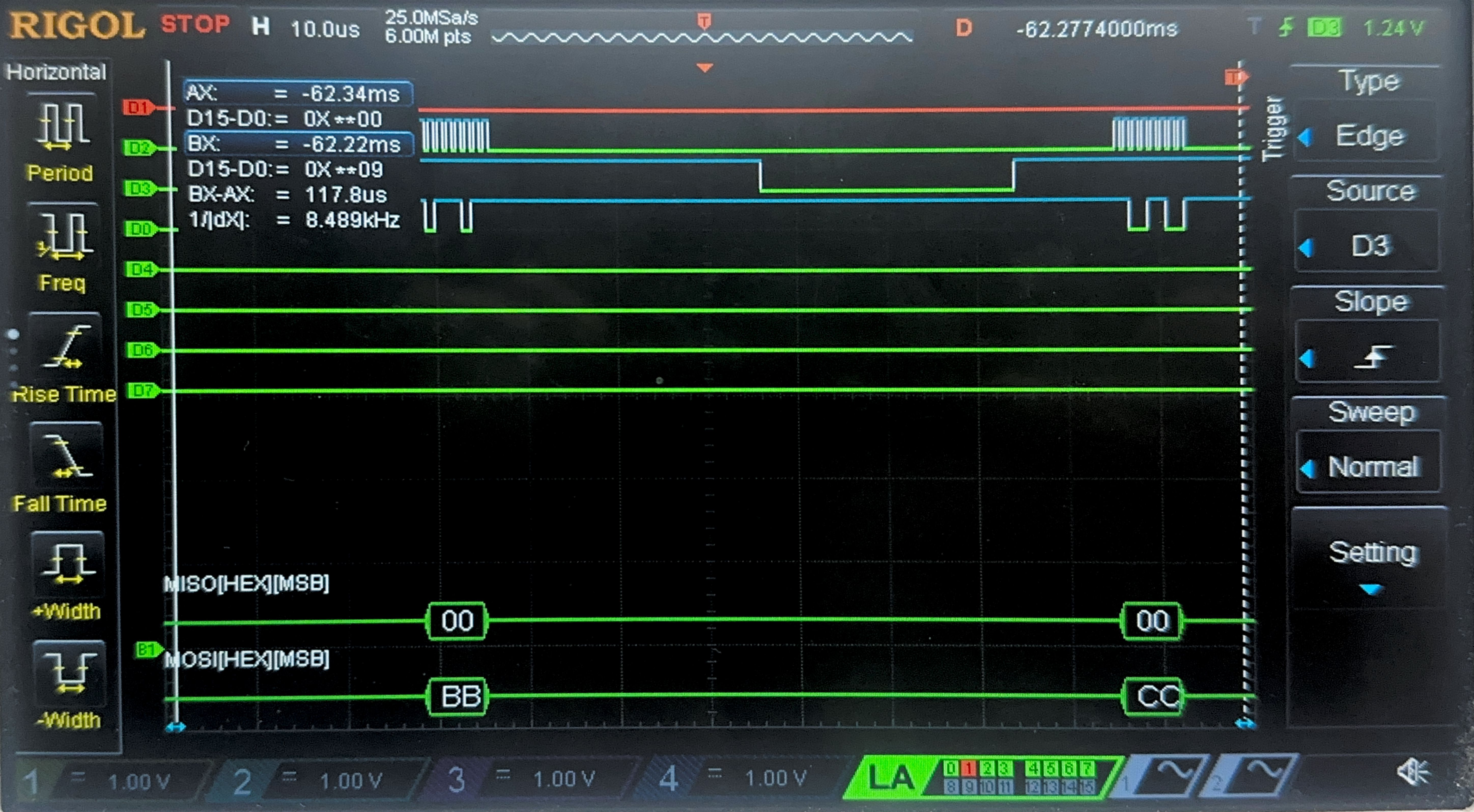 Below are the images from the return transaction, on MISO/CIPO where the FPGA is responding with the ciphertext: