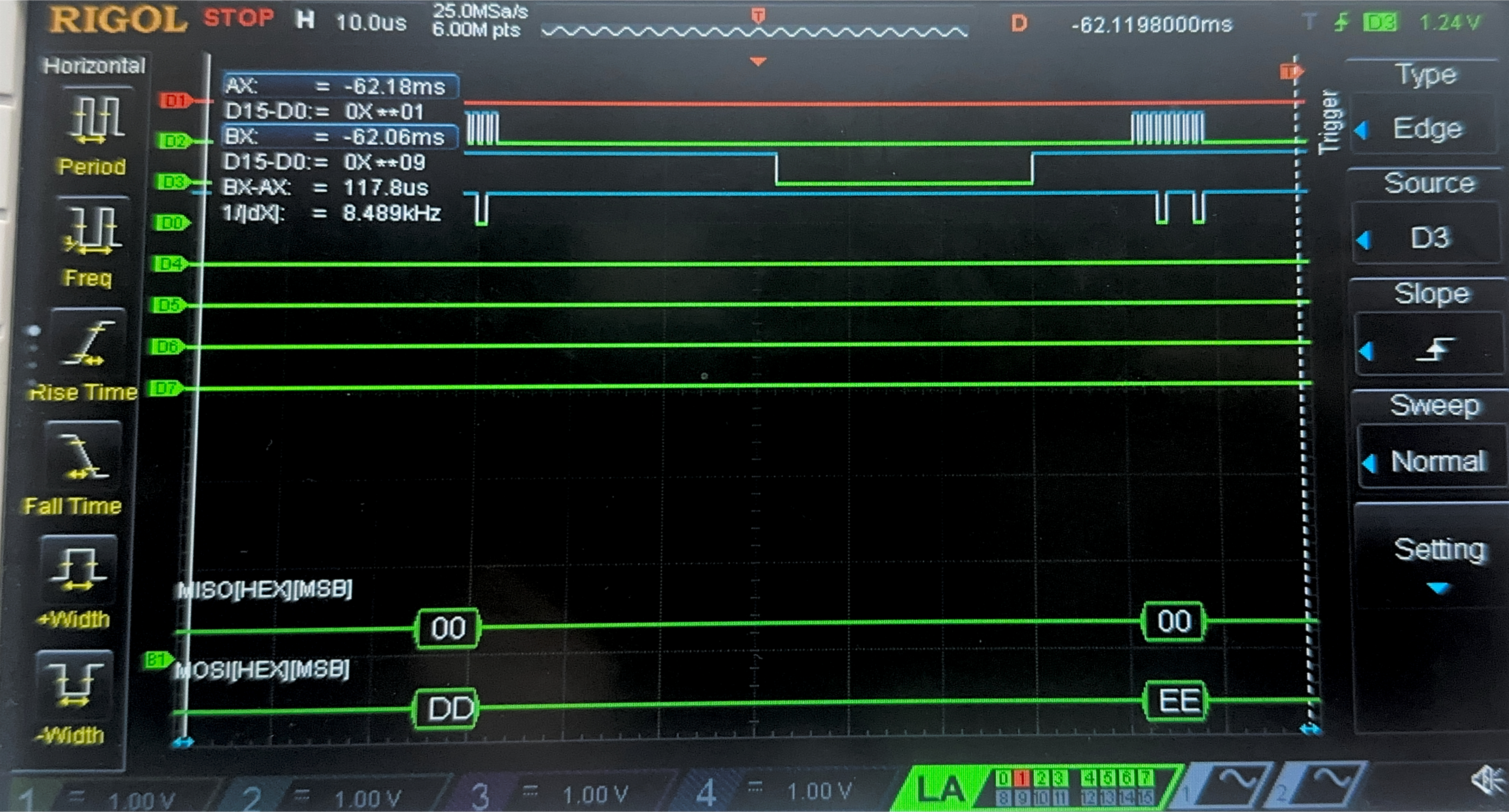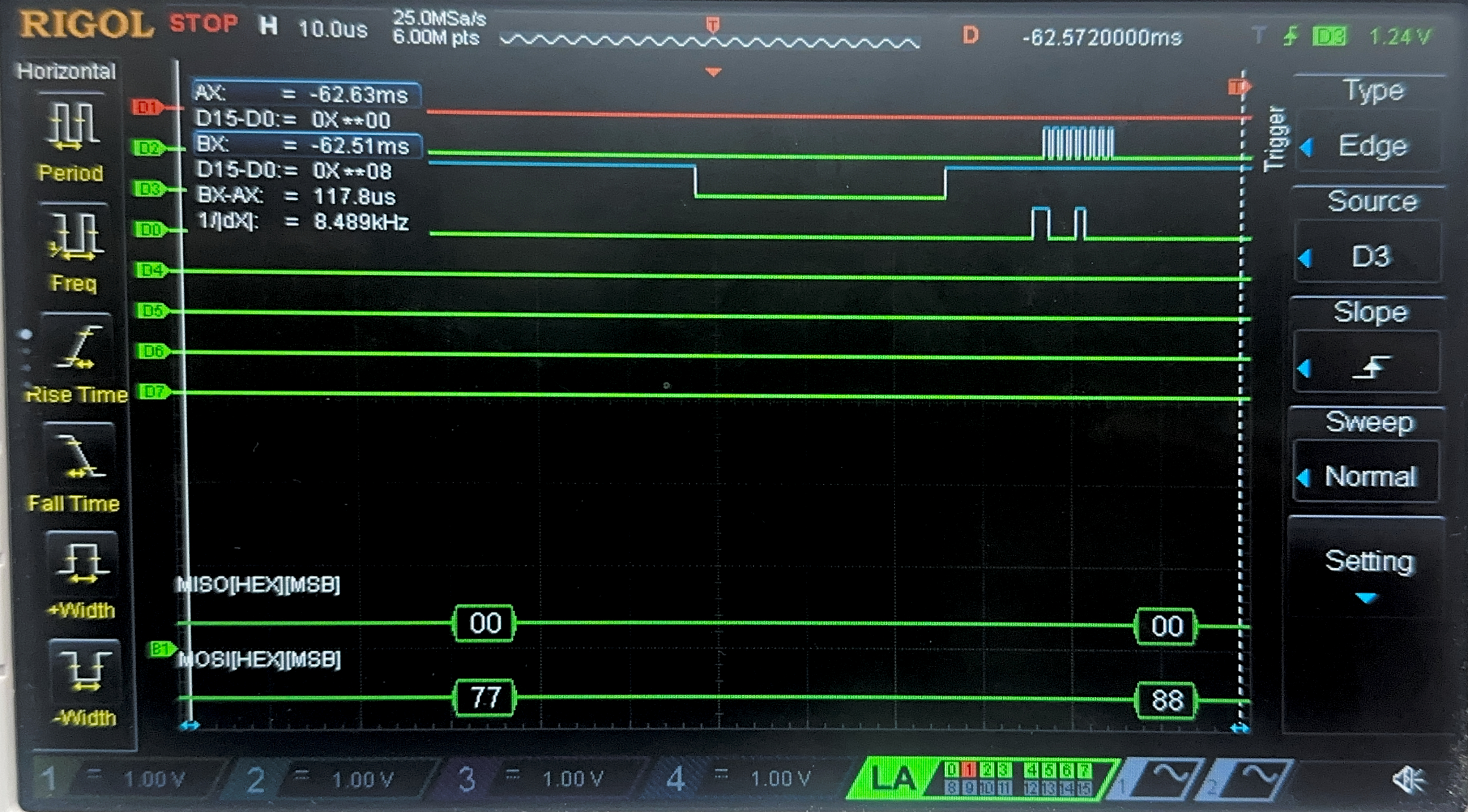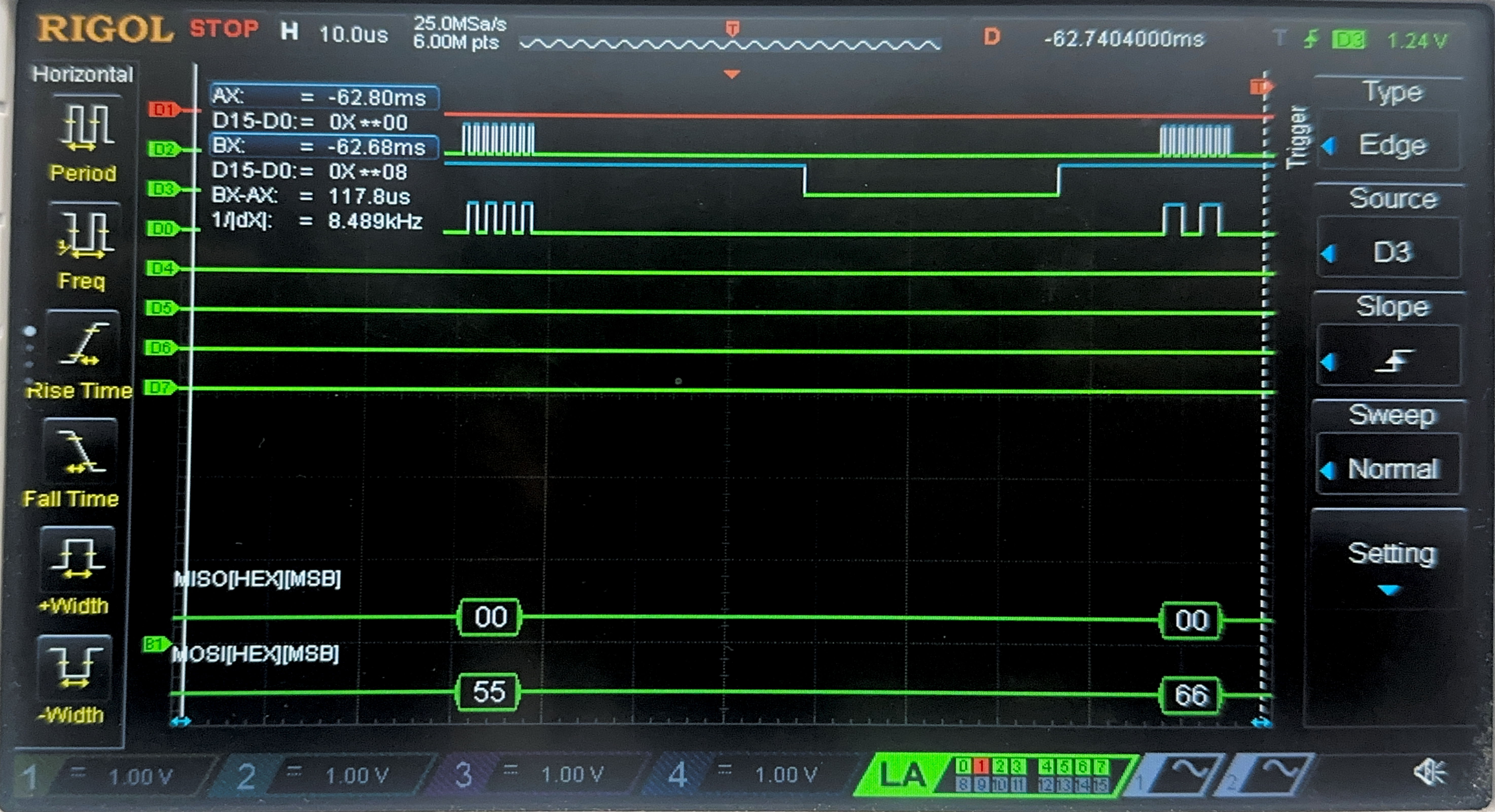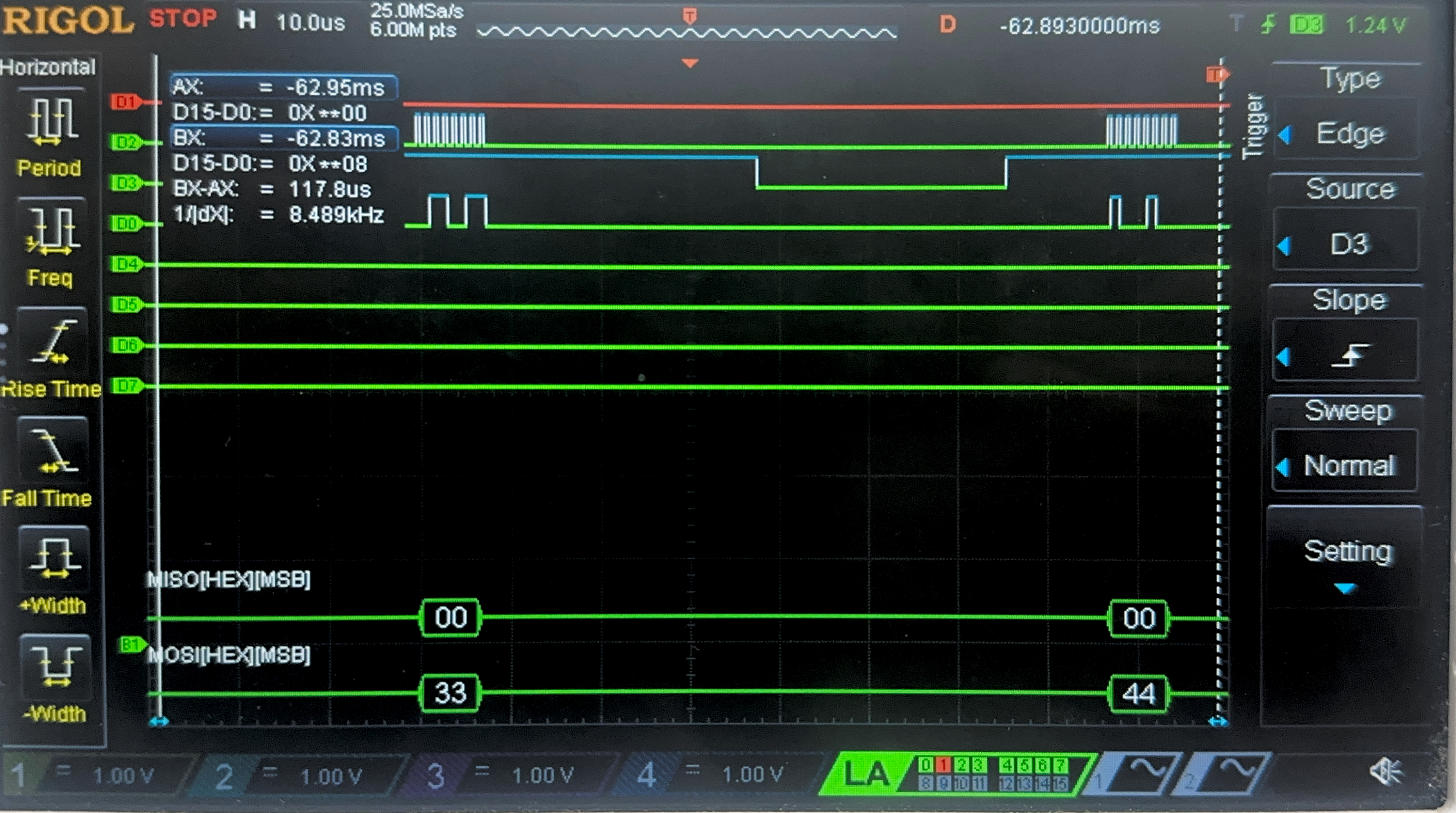 Below are the images from the return transaction, on MISO/CIPO where the FPGA is responding with the ciphertext: