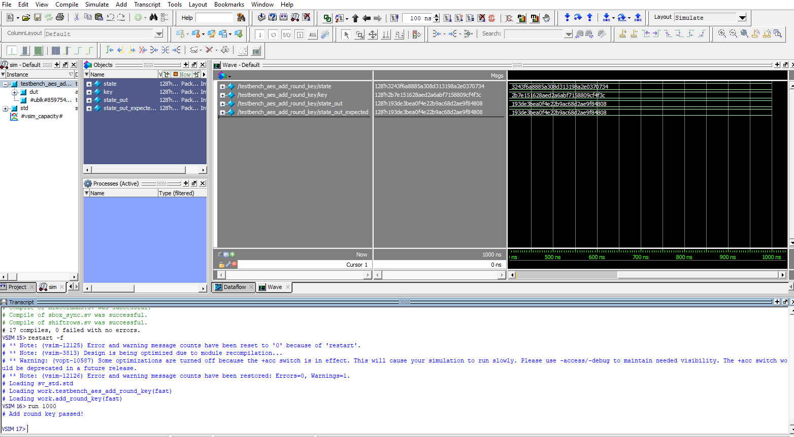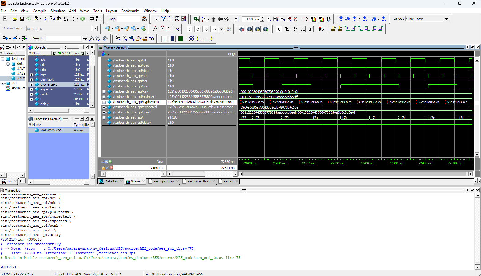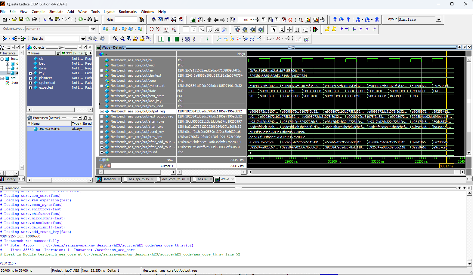 Below are the test benches for the AES core and AES core with SPI.