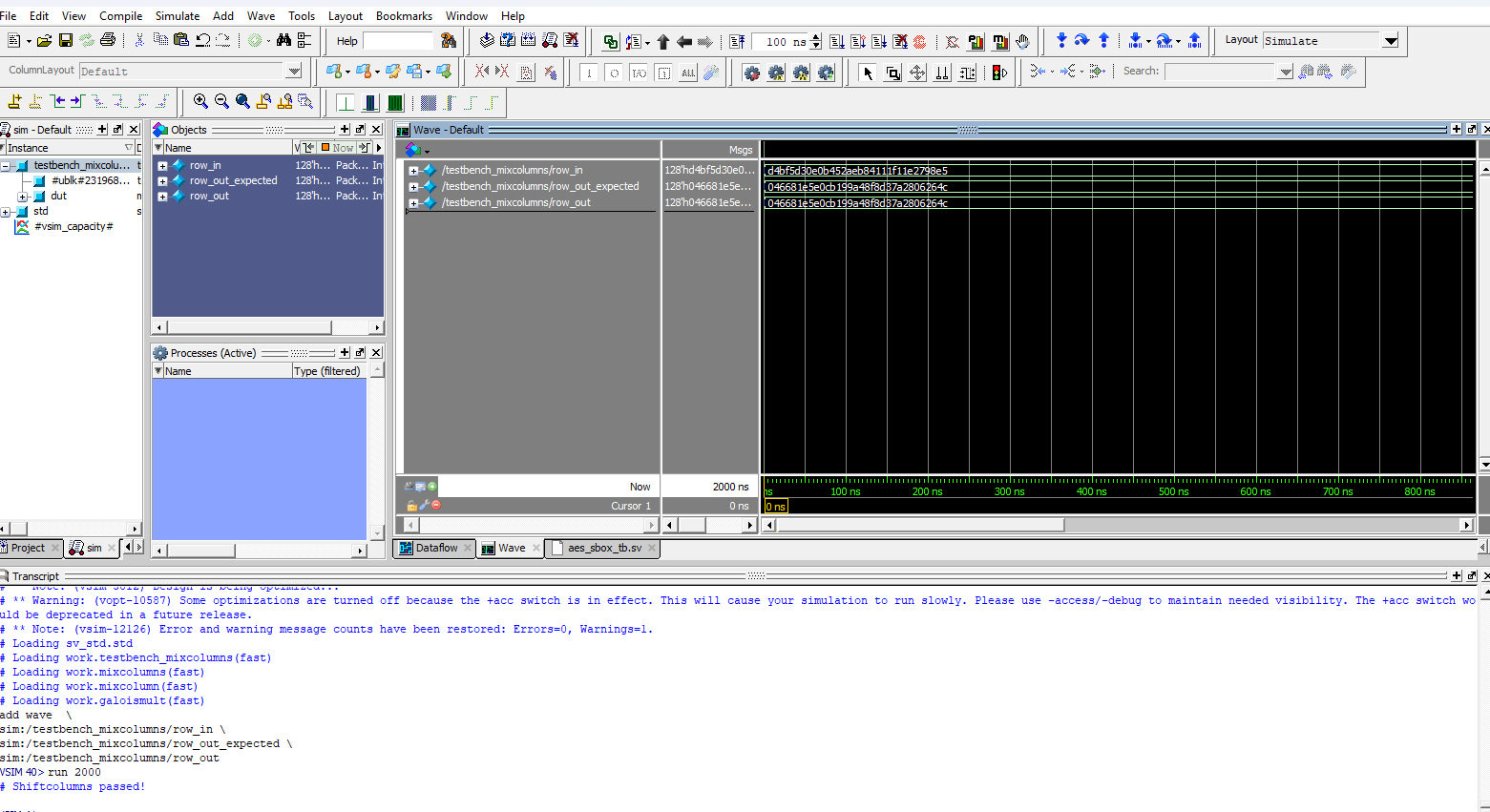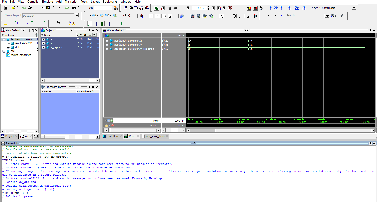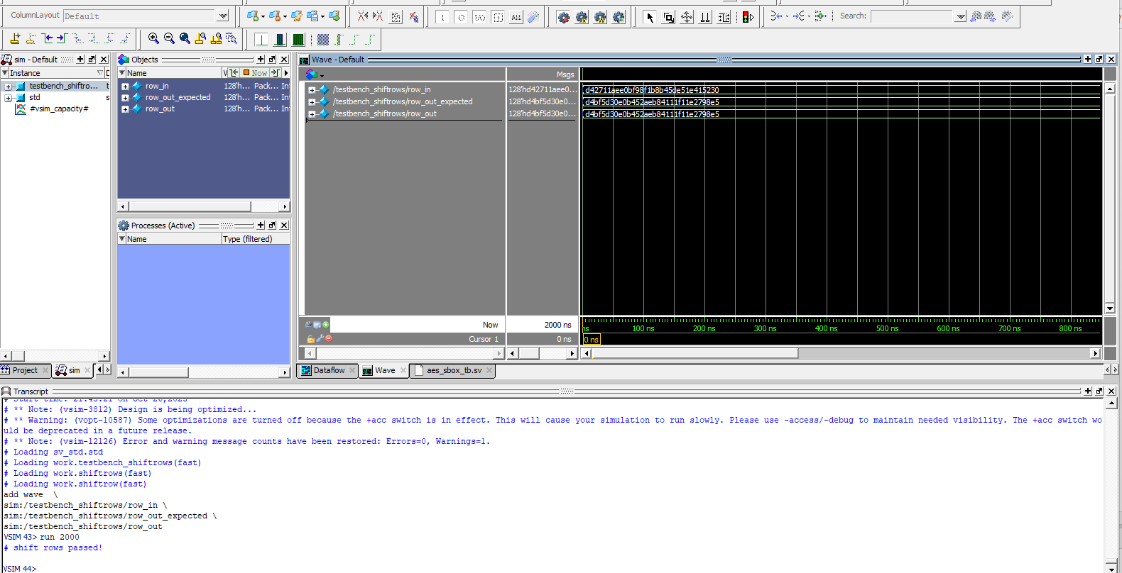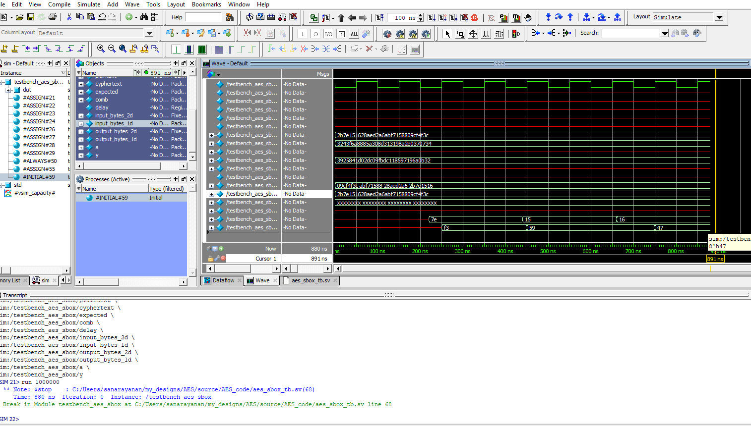 Below are the test benches for the AES core and AES core with SPI.