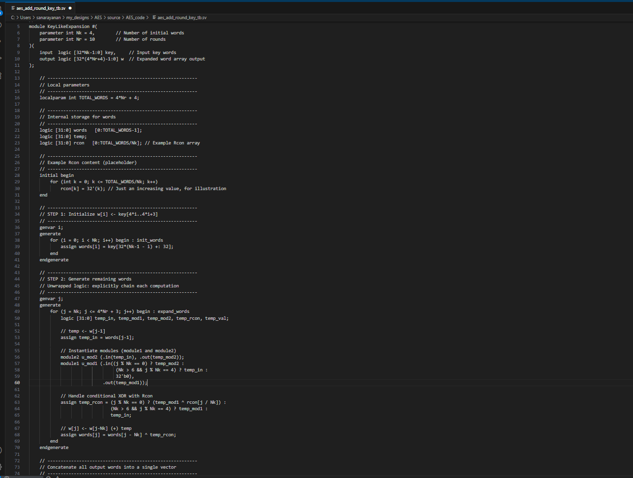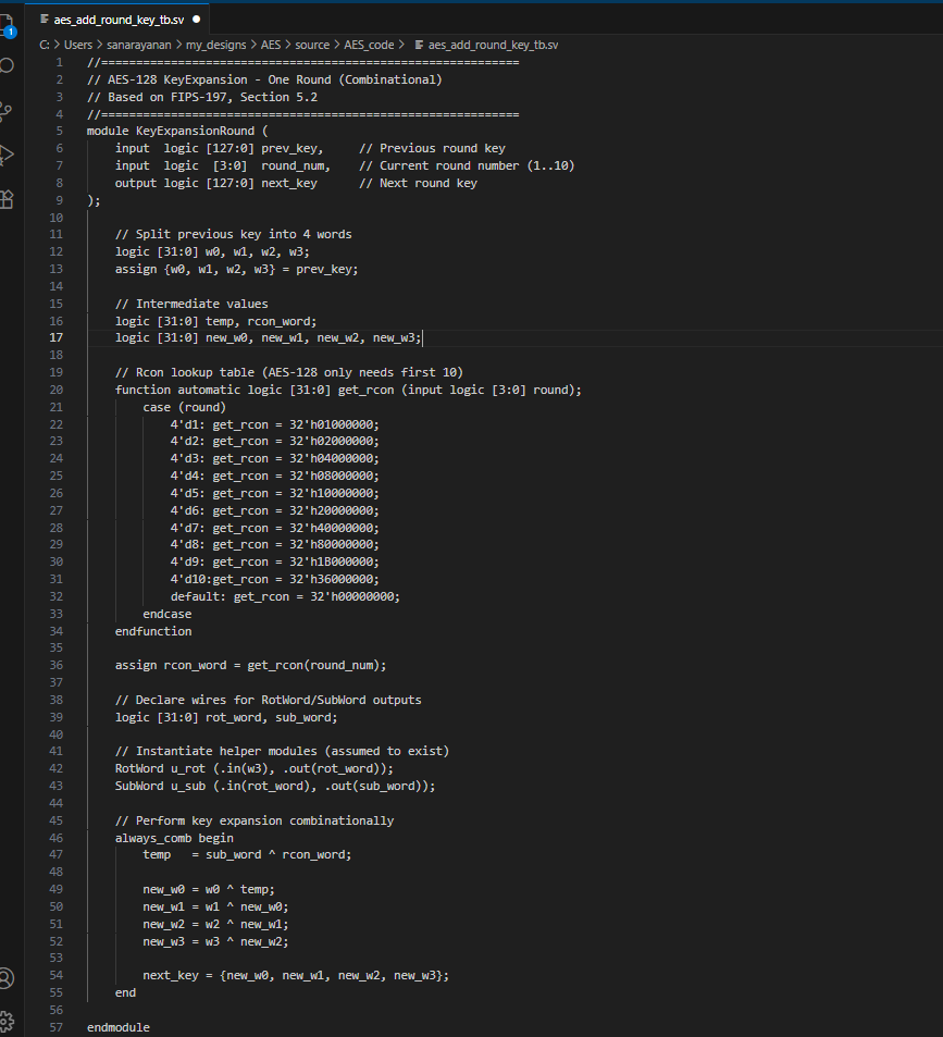 Figure __ shows the result of the AI engine writing verilog to create the KeyExpansion module. Overall, the code works pretty well, and it even breaks it up by round instead of doing it all at once and then using that result. Additionally, it defines more helper modules to take care of tasks like shifting, which is good since these features are used often in other modules too. Overall, it looks pretty correct and it compiled. Additionally, it new all the round constants, and I was really surprised about this.